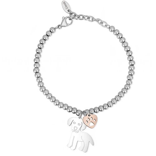 bracciale con perline in acciaio e ciondolo a forma di cane con zampetta rosè. bracciale cm 20 accorciabile a 16 cm