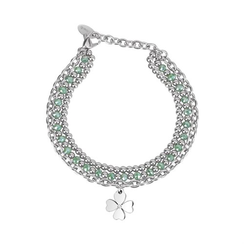 Bracciale 2JEWELS in acciaio 316L con vetro verde chiaro, ciondolo quadrifoglio e cristalli cm 19.