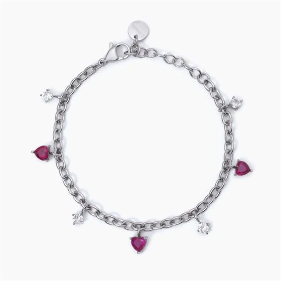 Bracciale in acciaio 316L catena forzatina 3.7 mm, con pendente a forma di cuore 5x5mm. con rubino sintetico e zirconi bianchi Ø 3.5mm, lunghezza regolabile da 16 a 19 cm