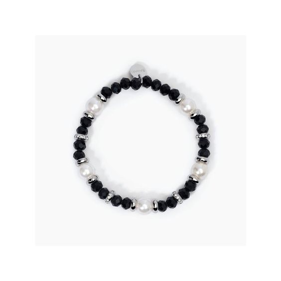 Bracciale elastico in acciaio 316L, con glass nero sfaccettato Ø 6 mm, perla conchiglia Ø 8 mm e cristalli Ø 1.5 mm, lunghezza 18 cm