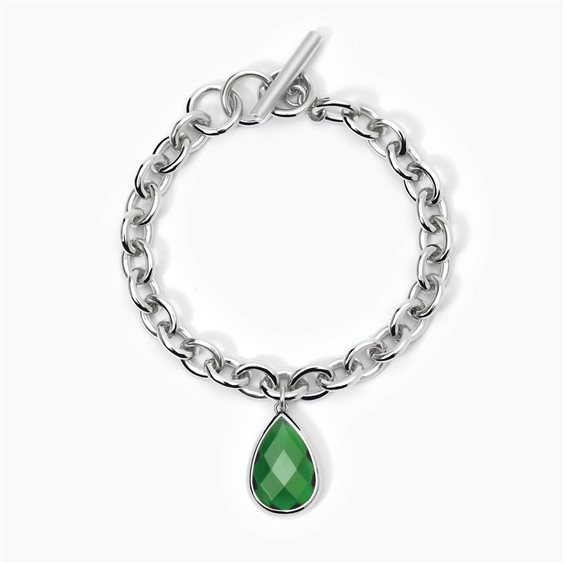 Bracciale in acciaio 316L con catena rolò 7.5 mm, ciondolo con glass verde taglio goccia 20x14 mm e cristalli Ø 2 mm, lunghezza regolabile da 17 a 20 cm