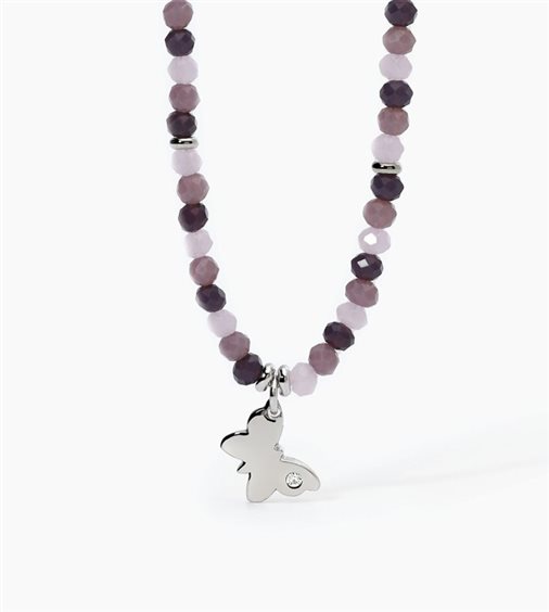 Girocollo in acciaio 316L con multicolor glass Ø 4 mm e pendente farfalla 9.5x11 mm con cristalli bianchi Ø 1.5 mm, lunghezza regolabile da 38 a 43 cm.