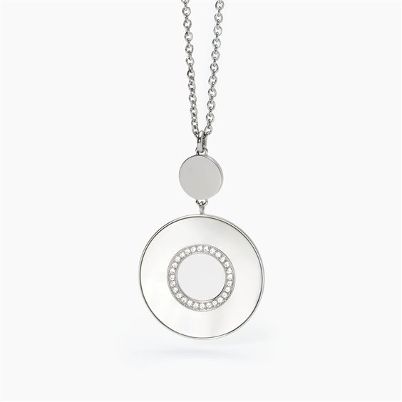 Girocollo in acciaio 316L con catena forzatina 2 mm, disco lucido Ø 10 mm, disco madreperla Ø 27 mm e cristalli Ø 1.25 mm, lunghezza regolabile da 40 a 45 cm