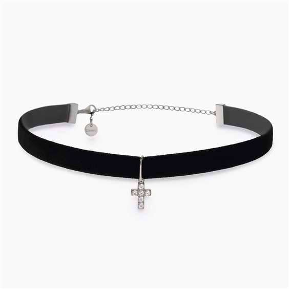 Choker in velluto di poliestere, con acciaio 316L pendente croce 9x12 mm e zirconi bianchi Ø 2.5 mm, lunghezza regolabile da 30 a 37 cm
