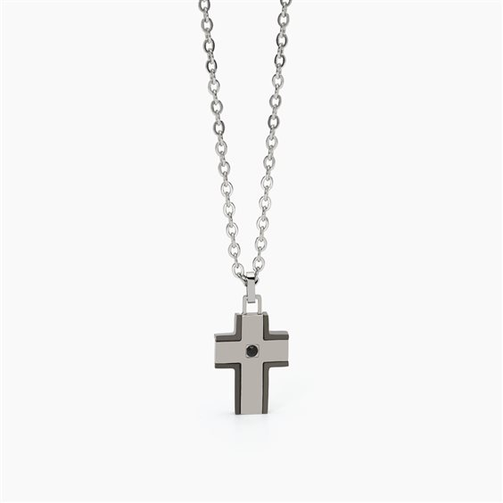Collana in acciaio 316L con catena forzatina 2 mm, pendente croce satinato e martellato 19x15 mm con PVD Gunmetal e cristallo nero Ø 2 mm, lunghezza 50 cm
