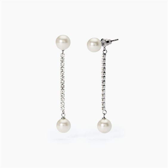 Orecchini in acciaio 316L con perle conchiglia Ø 8 mm e tennis di cristalli bianchi Ø 2 mm, lunghezza totale orecchino 5.5 cm