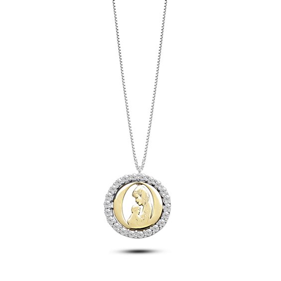 Collana donna Ambrosia Gioielli - codice AGZ 322. Girocollo con catena veneziana realizzata in oro bianco 18kt (750‰). Pendente circolare (rotondo) con raffigurazione Sacra della Madonna con Gesù in oro giallo 18kt (750‰) impreziosito nel contorno da zirconi bianchi (incastonati su oro bianco 18kt (750‰)). Chiusura anellino a molla. Diametro gioiello 1 cm. Lunghezza catena 42 cm. Made in Italy.