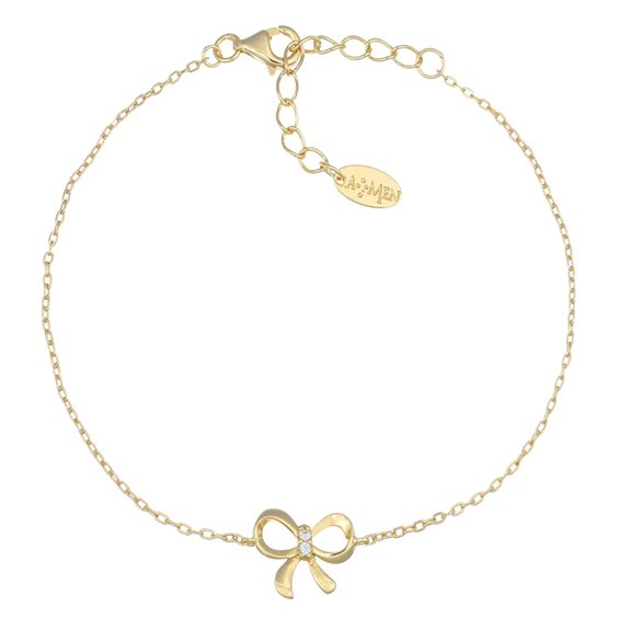 Bracciale Dorato Fiocco con Zirconi Bianchi Bracciale a catena in Argento 925 dorato. Al centro, un piccolo fiocco con due zirconi bianchi. Lunghezza regolabile da 16 a 19 cm con chiusura a moschettone.