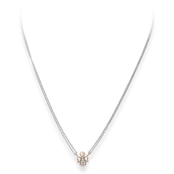 Collana in Argento 925 rodiato con angelo di colore rosa tempestato di zirconi bianchi. Catena di lunghezza personalizzabile da 40 a 44 cm. SCATOLA + GARANZIA.