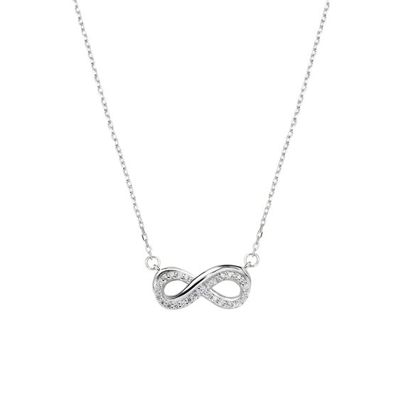 Collana Amore Infinito con Zirconi Collana in argento 925 rodiato con pendente a forma di simbolo dell'infinito in doppio design, liscio e con zirconi bianchi. Il charm è lungo 7 mm e largo 15 mm, mentre la catena ha lunghezza regolabile da 40 a 45 cm con chiusura a moschettone e catenina di allungo.