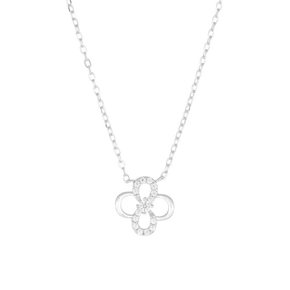 Collana Quadrifoglio d'Infiniti con Zirconi Bianchi Collana a catena in Argento 925 rodiato con zirconi bianchi. Al centro, due simboli dell'infinito sovrapposti formano un quadrifoglio. Lunghezza regolabile da 40 a 45 cm con chiusura a moschettone.