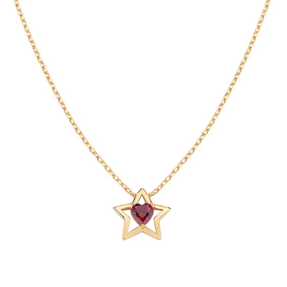 Collana in argento 925‰ con doratura in oro giallo e zircone rosso. Lunghezza 40+5 cm