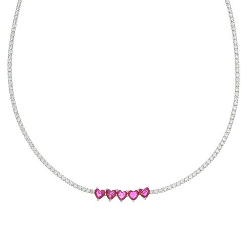 Collana Tennis Cinque Cuori Rubino - Collana in AG925 con zirconi rossi taglio cuore zirconi bianchi - Rodio - Lungh. 38 + 5 cm - cuori ⌀ 4 mm