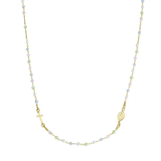 Rosario Girocollo Dorato con Cristalli e Perle Rosario girocollo in argento 925 con grani da 3 mm di cristalli sfaccettati rosa, verdi e azzurro pastello alternati a perle di cristallo bianche, croce e medaglietta rappresentante la Madonna Miracolosa. La collana ha lunghezza regolabile da 50 a 52 cm con chiusura a moschettone e catenina di allungo.