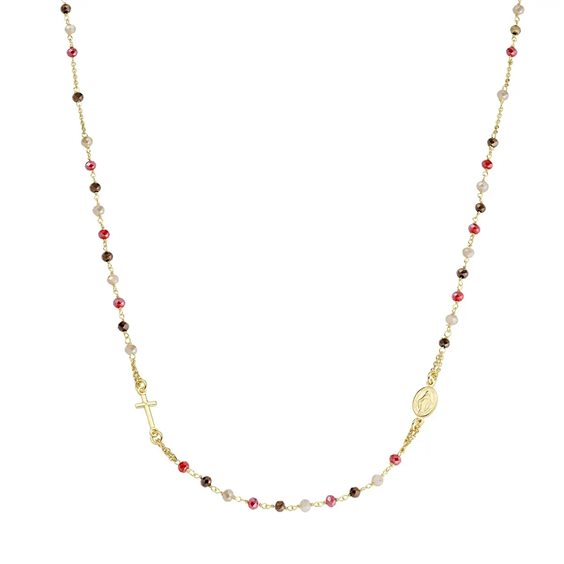 Rosario Girocollo Dorato con Cristalli Multicolor Rosario girocollo in argento 925 con grani da 3 mm di cristalli sfaccettati marroni, grigi e rosso corallo, croce e medaglietta rappresentante la Madonna Miracolosa. La collana ha lunghezza regolabile da 50 a 52 cm con chiusura a moschettone e catenina di allungo.