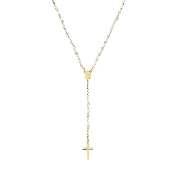 Rosario Classico Dorato con Perle di Cristallo Rosario classico in argento 925 con grani da 3 mm di cristalli perle di cristallo bianche, croce e medaglietta rappresentante la Madonna Miracolosa. La collana ha lunghezza regolabile da 48 a 50 cm con chiusura a moschettone e catenina di allungo.