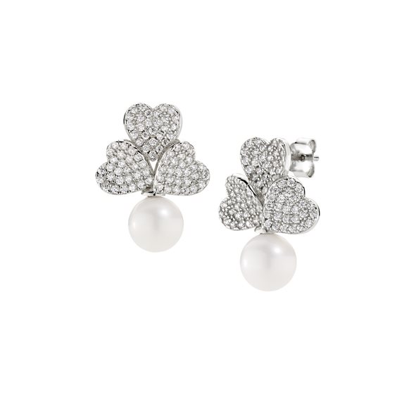 Orecchini in argento 925 rodiato con perle da 5 mm e cuori in pavé di zirconi bianchi. Lunghezza totale dell'orecchino: 1,8 cm. Chiusura a farfallina.