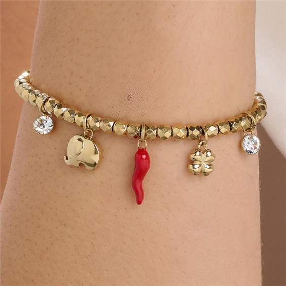 BUON AUSPICIO, FORZA, PROTEZIONE La sua simbologia è diffusa in tutte le civiltà. Avere un corno portafortuna, lungo e affusolato, sprigiona fortuna e benessere a tutta la famiglia e le generazioni future. Bracciale con sfere in acciaio 316L, finitura pvd oro 14K e pendenti con elefante, quadrifoglio, cornetto con smalto rosso e cristalli.