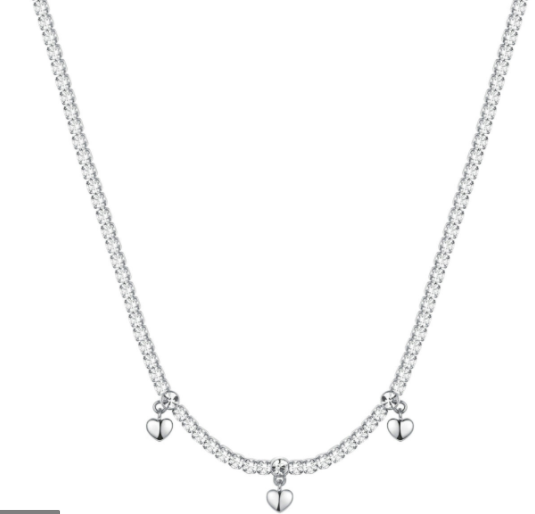 Collana tennis con zirconi bianchi mm.2.5 e tre cuoricini centrali mm.5. Lunghezza 44 cm. regolabile con anellini finali.
