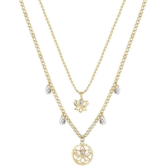 Collana Da Donna Di Brosway Della Collezione Chakra. Collana Chakra In Acciaio 316L Doppio Filo, Finitura Oro, Con Fiore Di Loto Simbolo Di Rinascita, Forza, Bellezza E Cristalli Crystal. Lunghezza: 490 Mm. Peso: 8 G.