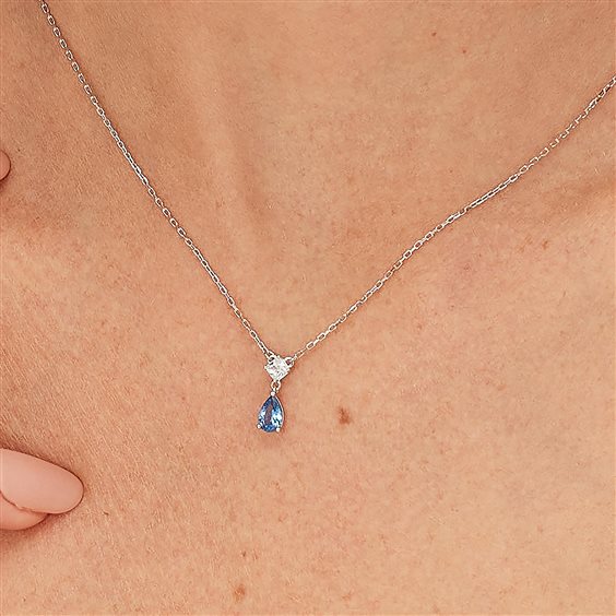 Collana girocollo in argento rodiato 925‰ e pendente con square cubic zirconia e pear cubic zirconia colore sapphire.