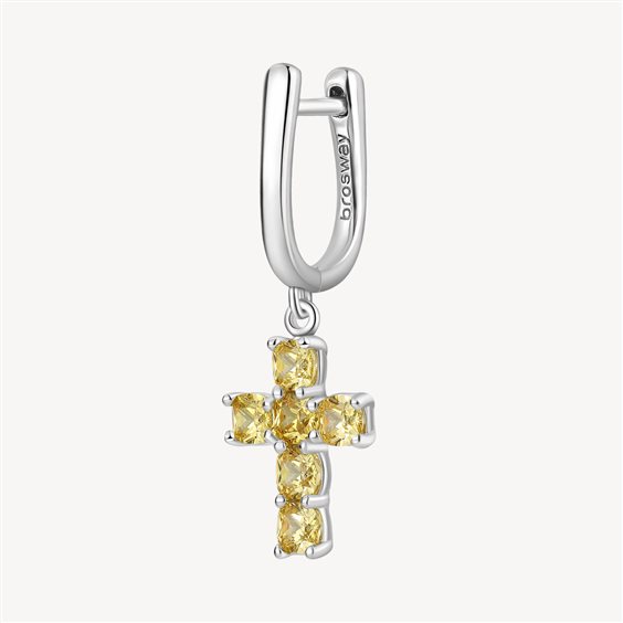 Orecchino singolo in argento rodiato 925‰ con pendente a forma di croce e cushion cubic zirconia colore golden yellow.