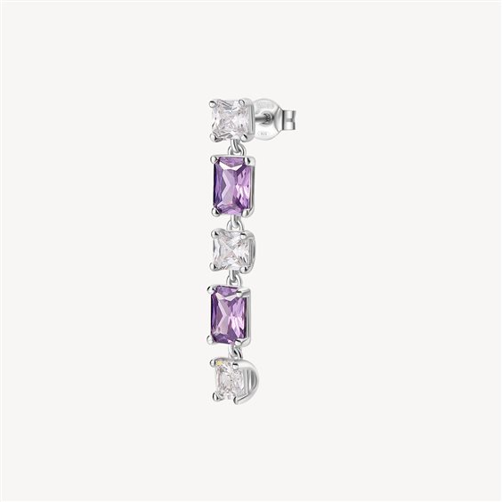 Orecchino singolo pendente in argento rodiato 925‰ con cushion cubic zirconia chiari e baguette cubic zirconia colore amethyst.