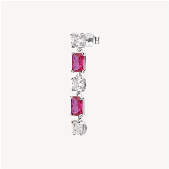 Orecchino singolo pendente in argento rodiato 925‰ con cushion cubic zirconia chiari e baguette cubic zirconia colore ruby.