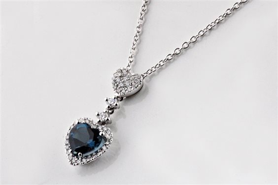 Girocollo in oro bianco 18 KT. con un topazio London Blue dal taglio a cuore, accompagnato da dei diamanti taglio brillante del peso complessivo di ct. 0.32, colore G, purezza VS.