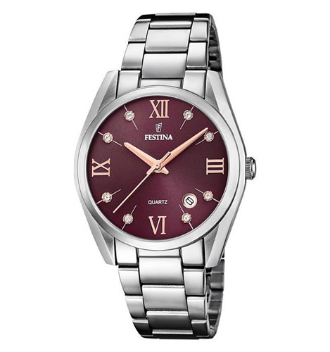 Orologio donna , acciaio 316L , movimento al quarzo M2115 , cassa mm 36 , quadrante bordeaux , datario , indici e lancette rosè , indici con zirconi bianchi , fondello a pressione , vetro minerale , cinturino regolabile lucido , chiusura con pulsanti.