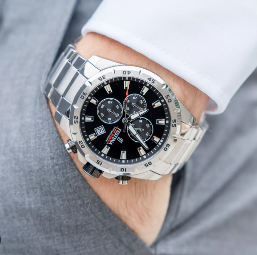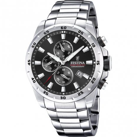 Orologio cronografo da uomo della collezione SPORT, con cassa in acciaio del diametro di 45 Mm. Quadrante nero e datario, cinturino in acciaio. Resistenza all'acqua 10 atmosfere, meccanismo al quarzo.