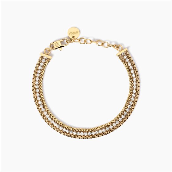 Bracciale regolabile in acciaio dorato con due catene e tennis di cristalli bianchi. • Dimensione catena franco: 2 mm • Dimensione catena veneta: 2 mm • Diametro cristalli: 2 mm • Misura regolabile, lunghezza da 15,5 a 18,5 cm • Materiale: Acciaio 316L, Cristalli, PVD giallo