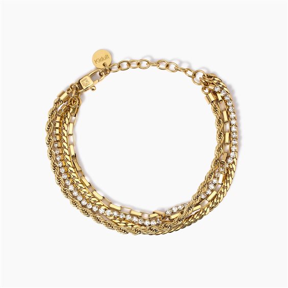 Bracciale regolabile in acciaio dorato con tre catene e tennis di cristalli bianchi. • Dimensione catena corda: 4 mm • Dimensione catena groumette: 3 mm • Dimensione catena allungata: 2,5 mm • Diametro cristalli: 2 mm • Misura regolabile, lunghezza da 16 a 19 cm • Materiale: Acciaio 316L, Cristalli, PVD giallo