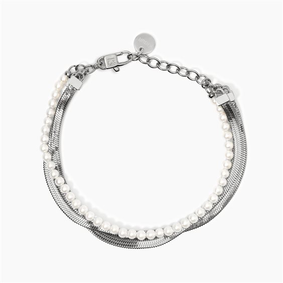 Bracciale regolabile con catena herringbone in acciaio e perle conchiglia. • Dimensione catena: 3 mm • Diametro perle conchiglia: 3 mm • Misura regolabile, lunghezza da 16 a 19 cm • Materiale: Acciaio 316L, Perle conchiglia