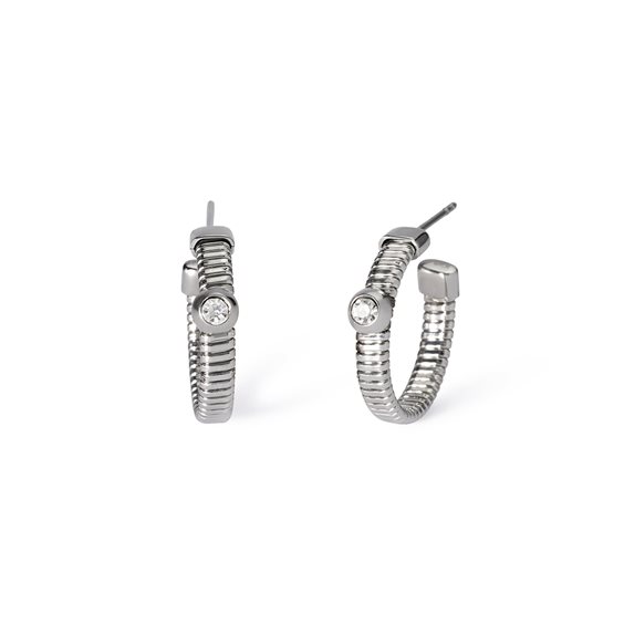 Orecchini in acciaio 304 e 316L, Ø interno 2 cm, esterno 2.5 cm, con maglia tubogas e cristalli. Dimensioni: maglia 4x2 mm, cristalli Ø 3 mm