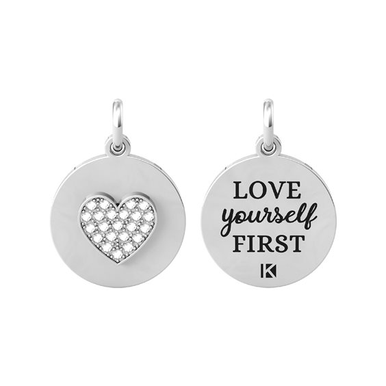 Ciondolo in acciaio 316L con elemento a cuore e cristalli bianchi. Scritta: LOVE yourself FIRST. Dimensioni: ciondolo Ø 15 mm, cuore 8.5x8 mm, cristalli Ø 1.25 mm