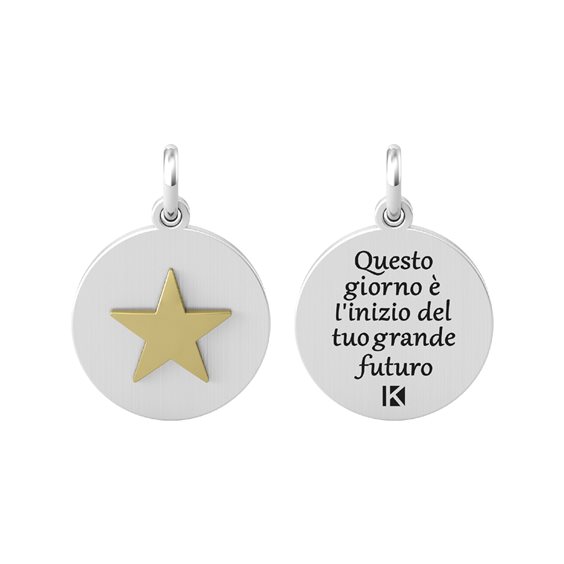 Ciondolo in acciaio 316L satinato con elemento a stella in PVD giallo. Scritta: Questo giorno è... futuro. Dimensioni: ciondolo Ø 15 mm, stella 9x8.5 mm
