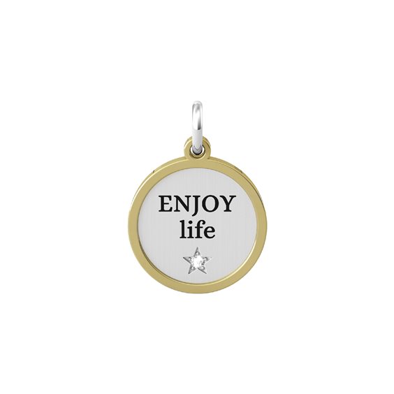 Ciondolo in acciaio 316L satinato e lucido con PVD giallo e cristallo bianco. Scritta: Enjoy life. Dimensioni: ciondolo Ø 15 mm, cristalli Ø 1.5 mm