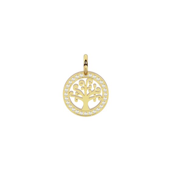 Ciondolo in acciaio 316L e PVD giallo albero della vita con cristalli. Dimensioni: ciondolo Ø 13 mm, cristalli Ø 1 mm