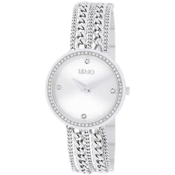 Orologio Solo Tempo Da Donna Di Liu Jo Della Collezione Chains. Modello Realizzato Totalmente In Acciaio Di Colore Argento. Bracciale Con Multi Catene Con Chiusura Finale In Maglie Regolabile Di 19,5 Cm x 16Mm. Orologio Con Giro Brillantini Intorno Alla Cassa E Quadrante Bianco. La Cassa E' Di 32Mm. Movimento: Vj20. La Resistenza All'Acqua È Di 5Atm.