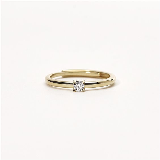 Anello solitario in argento dorato con zircone. • Incastonatura zircone a griffe a tre punte • Diametro dello zircone: 3 mm • Misura regolabile, da 9 a 17 • Materiale: Argento 925, Zirconi