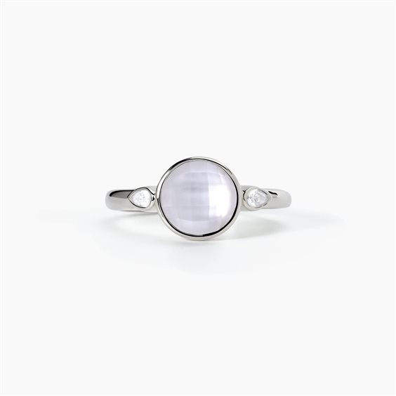 Anello in argento 925/°°° con pietra cabochon doublet madreperla e cristallo di rocca Ø 8 mm e cz bianchi 3x2 mm. Misura regolabile da 11 a 19 mm