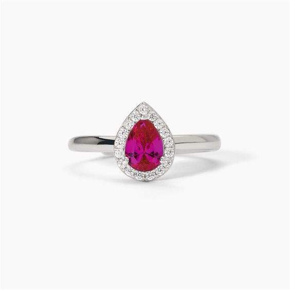 Anello in argento 925/°°° rodiato rubino sintetico taglio goccia 5x7 mm e zirconi bianchi Ø 1.25 mm, misura regolabile da 11 a 19