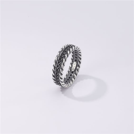 Anello uomo , argento 925% brunitO, lavorazione torchon , zirconi neri incastonati con griffe. Scatola e garanzia originali.