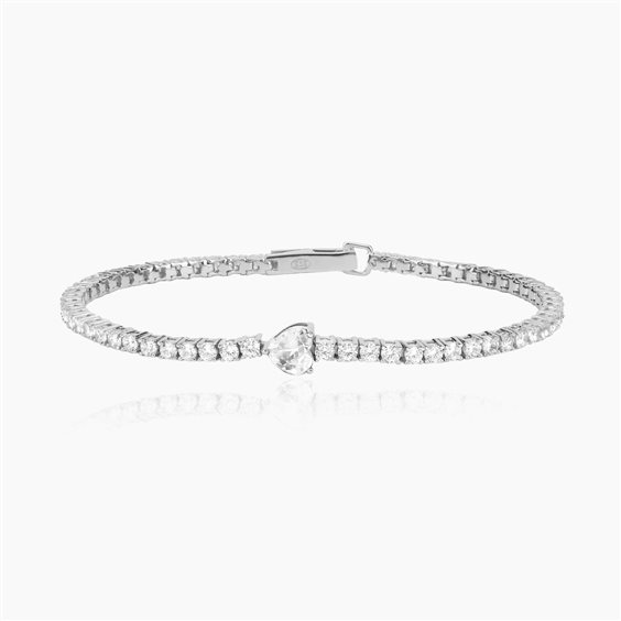 Bracciale tennis in argento con zirconi e cuore in zircone. • Incastonatura delle pietre a griffe • Dimensione del cuore: 6,5 x 6 mm • Diametro degli zirconi: 2,5 mm • Misura medium, lunghezza 18 cm