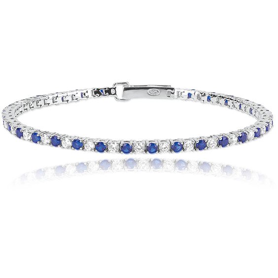 Bracciale argento tennis rodiato con zaffiro sintetico e zirconi bianchi • Incastonatura degli zirconi a griffe • Diametro degli zirconi: 2,5 mm • Chiusura a pinza con molla • Misura Media, lunghezza 18 cm • Materiale: Argento 925, Zirconi