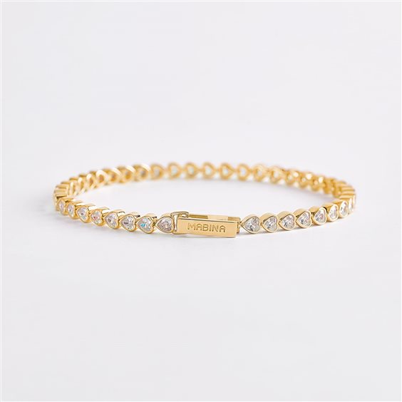 Bracciale tennis in argento dorato con zirconi a cuore. • Incastonatura degli zirconi a castone • Dimensione degli zirconi: 3 x 3 mm • Chiusura a pinza con molla • Misura small, lunghezza 16 cm; misura medium, lunghezza 18 cm • Materiale: Argento 925 dorato, Zirconi