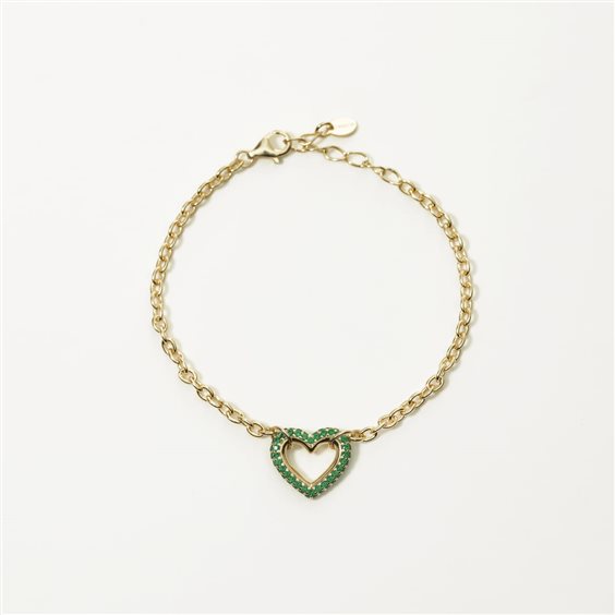 Bracciale in argento 925 dorato a catena rollò con cuore al centro impreziosito da smeraldi sintetici incastonati. Misura regolabile da 16 a 19 centimetri con chiusura a moschettone. La dimensione del cuore è di 15×13 mm