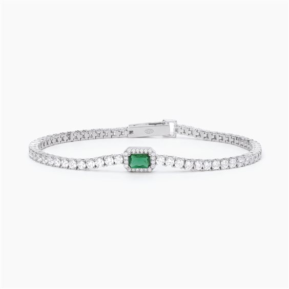 Bracciale in argento con zirconi bianchi e smeraldo sintetico taglio baguette sul centro. • Incastonatura dello smeraldo sintetico a castone • Dimensione dello smeraldo sintetico: 6 x 4 mm • Dimensione degli zirconi: 2.5 e 1 mm • Chiusura a pinza con molla • Misura medium, lunghezza 18 cm • Materiale: Argento 925, Smeraldo sintetico, Zirconi