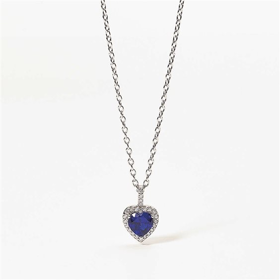 Collana donna , argento 925 rodiato , girocollo maglia rolò , lunghezza cm 45 regolabile fino a cm 40 , pendente con zaffiro sintetico a forma di cuore , zirconi bianchi incastonati con griffe , chiusura a moschettone. Scatola e garanzia originali.